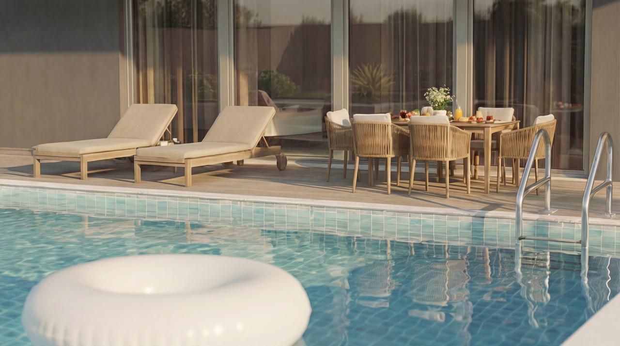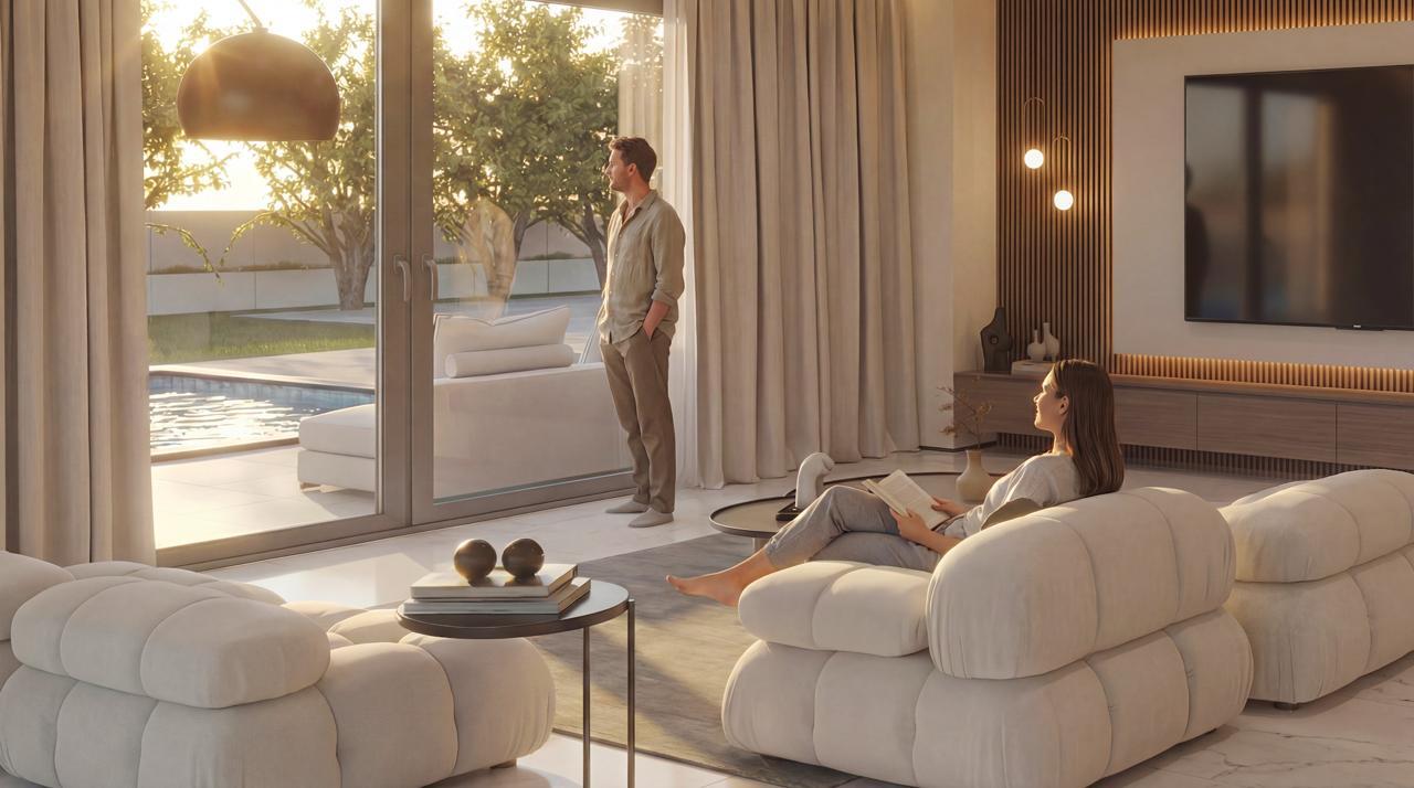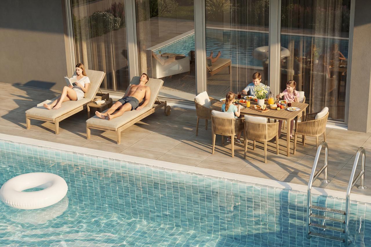 Апартаментът има фронтално изложение. С Имотът разполага със следните екстри: слънчеви колектори за топла вода, камина, климатик, собствен басейн, градина, райграс, cградата има асансьор, гараж, отопление, алармена система, складово помещение.